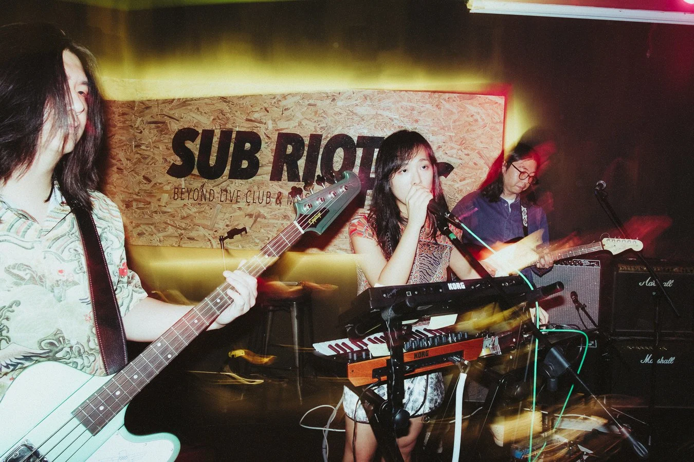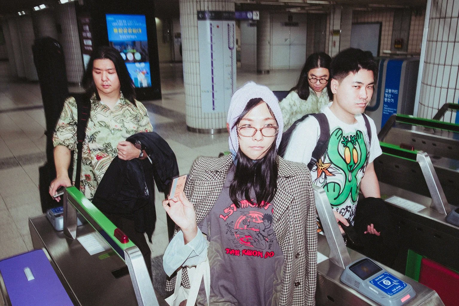 In an old market full of produce, hot street food, and busy passers-by, there is a DJ playing. Some workers join in the fun, dancing and cheering, still aproned and gloved. Their charisma draws in more people, some fresh-faced and others weathered. A few younger, enthusiastic workers are draped in excessive patterns and bold tones, beaming. Then one of them dons a jewelled headdress and slinks onto the stage. A few more follow suit, pulling out their picks, a karaoke-style soundboard, and all manner of cords and pedals. The DJ cuts the music, and suddenly the market is bombarded with psychedelic waves. There is undeniable funk, but the keys are playing hyper-disco synth, and the singer has a soundboard firing off random laser noises and "아주씨" soundbites. Then the guitarist leaps off stage, shepherding the crowd as he melts his guitar, losing his hat in the process. The next second, it's surf rock, rolling toms in proper form — chaos minute to minute, but everyone is wrapped in the spell. Ageing market workers and twenty-somethings alike are going wild, the energy palpable from floor to ceiling. Full of sweat and hoarse from yelling, the crowd is ecstatic. This was one of Asian Spice House's earliest gigs with their current four-piece line-up.