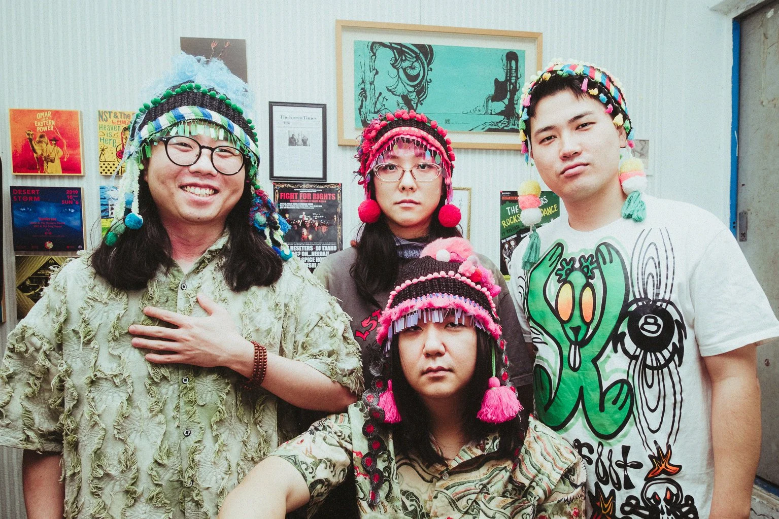 Asian Spice House chassés between genres whilst egging each other on, but amid the menagerie of sound, there are small threads connecting their music across generations and countries. Gakseoli (Pumba) were wandering vagabond troupes in Korea who performed music — often critical and comical — whilst wearing colourful scraps of clothing. The band transmutes the festive, ragged aesthetic of these storied figures into thrifted, mismatched ensembles: rice hats, handmade headwear, Hawaiian shirts, and animal prints. The band's only rule for their fashion? "We should never look like we are trying to be cool," declares Raffina. Their audacious wardrobe is part of the entertainment. Raffina initially found inspiration in these jester-esque figures because "it's fascinating how heavy stories can be presented in a playful way. Life is inherently grim — each person can find a connection with that." Whilst the group touches on these ideas, they are more preoccupied with searching for the "Asian Root Sounds" that connect cultures across the continent. The band's music has a decidedly fun and psychedelic air, but they see a kinship with gut (Korean shaman rituals). Like those rituals, music is "performed for the well-being of the community," says SeungHyeon. "People who listen to our music can put down a certain part of their lives and feel lighter" — and that seems like the most honest summation of what the band does.